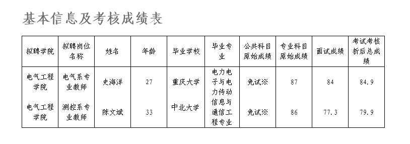 根据《重庆市事业单位公开招聘人员实施办法》(渝人发〔2006〕44号)和《重庆市人力资源和社会保障局关于印发〈重庆市事业单位考核招聘工作人员办法〉等6个公开招聘配套文件的通知》(渝人社发〔2016〕281号)要求,遵照《重庆科技学院2019年公开招聘事业单位工作人员简章》确定的招聘流程及考核程序,电气工程学院及人事处、科研处、教务处等职能部门联合对史海洋、陈文斌2名博士进行了考核。现将其基本信息及考核成绩予以公示。