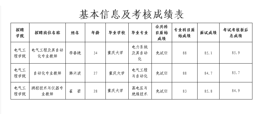 根据《重庆市事业单位公开招聘人员实施办法》(渝人发〔2006〕44号)和《重庆市人力资源和社会保障局关于印发〈重庆市事业单位考核招聘工作人员办法〉等6个公开招聘配套文件的通知》(渝人社发〔2016〕281号)要求,遵照《重庆科技学院2019年公开招聘事业单位工作人员简章》确定的招聘流程及考核程序,电气工程学院及人事处、科研处、教务处等职能部门联合对李春艳、韩兴波、崔豪3名博士进行了考核。现将其基本信息及考核成绩予以公示。