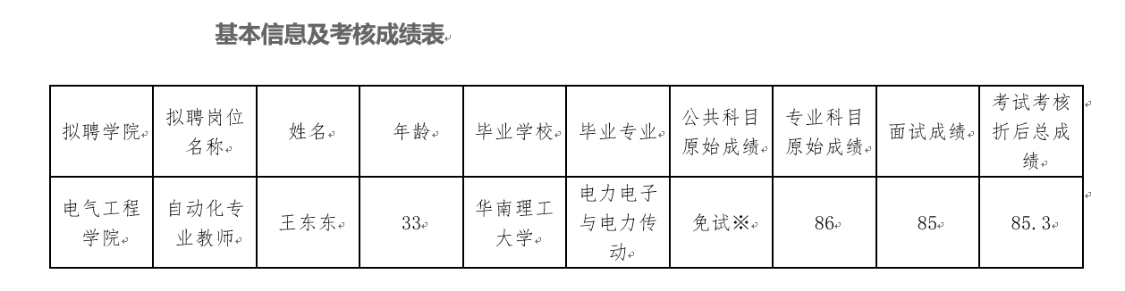 根据《重庆市事业单位公开招聘人员实施办法》(渝人发[2006]44号)和《重庆市人力资源和社会保障局关于印发〈重庆市事业单位考核招聘工作人员办法〉等6个公开招聘配套文件的通知》(渝人社发〔2016〕281号)要求,遵照《重庆科技学院2019年公开招聘事业单位工作人员简章》确定的招聘流程及考核程序,电气工程学院及人事处、科研处、教务处等职能部门联合对王东东博士进行了考核。现将其基本信息及考核成绩予以公示。
