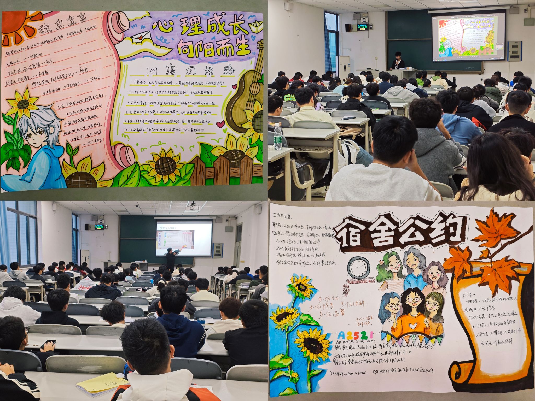 活动中,各新生寝室围绕主题,集体动手、共同创意,用手绘、漫画和真挚寄语等形式,生动描绘了初入大学的所见所感与对未来的憧憬。一份份图文并茂的小报,不仅装点了宿舍环境,更成为了承载室友情谊、传递积极心态的生动载体,有效增进了彼此的了解和情感融合。