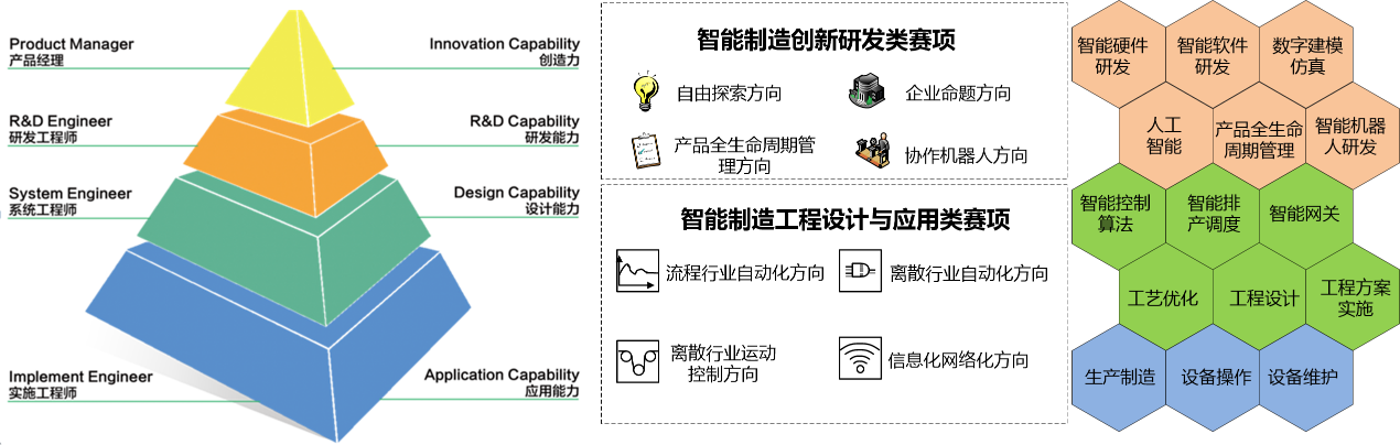 竞赛内容涉及智能制造领域中的科技创新、产品研发、工程设计和智能应用等,为我国智能制造发展培养和选拔具备解决复杂工程问题的技术及创新人才。大赛以企业真实的工程项目和科研项目作为竞赛赛题,以真实的工业设备和工业环境作为赛场,以工业企业的工程标准作为考核评分指标,全面锻炼学生解决复杂工程问题的综合能力、系统思维。