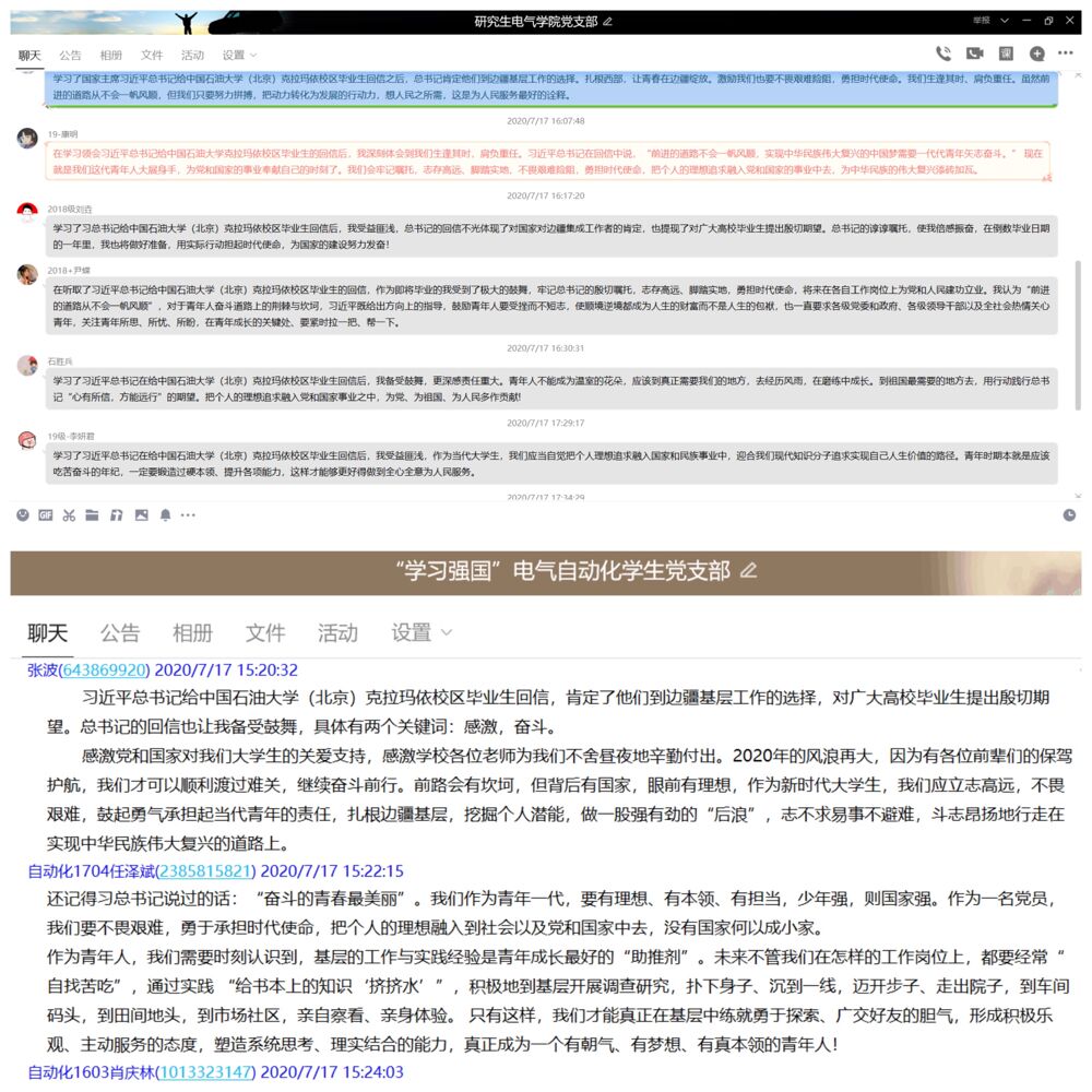 结合学习贯彻习近平总书记回信精神,电气工程学院党总支通过中心组集中学习、各党支通过QQ在线学习等形式,组织师生党员进行了深入研讨学习。分管学生工作的党总支副书记冯旭平研学交流时强调,要落实好立德树人根本任务,切实把中华民族优秀传统文化教育、爱国主义精神教育和社会主义核心价值观教育贯彻到学生培养全过程之中,教育引导大学生树立正确的世界观、人生观和价值观,培养德智体美劳全面发展的合格建设者和可靠接班人。毕业生辅导员兼自动化系学生支部书记刘铮表示,“习近平总书记给高校毕业生的重要回信,融入总书记对高校毕业生浓浓关怀与深切关爱。新时代的大学生要不畏艰难到边疆到基层去磨练意志提升本领,把个人理想融入国家事业中,不断挖掘个人潜能担当民族复兴使命。作为2020届的毕业生辅导员,我希望正在奔赴工作岗位的高校毕业生要更加坚定信仰跟党走,倍加珍惜自己的就业机会和就业岗位,心怀感恩,让青春在奋斗搏击中绽放出美丽的光彩。”