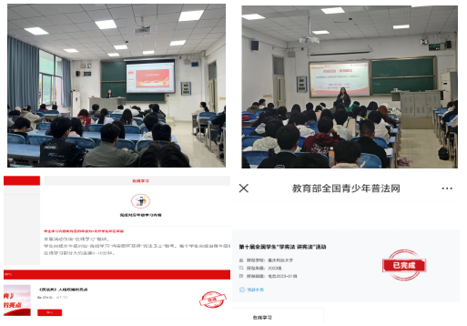 学院充分发挥班级基层组织作用,“线下主题班会+线上自主拓展”的双轨并行。辅导员紧密结合“国家网络安全宣传周”“第十届学宪法·讲宪法”等关键节点,围绕《中华人民共和国宪法》《中华人民共和国网络安全法》《中华人民共和国个人信息保护法》等内容开展案例分析,使法治观念深入人心。同时学院拓宽数字化教育阵地,利用教育部全国青少年普法网、中国大学生在线等平台,组织学生参与线上法治课程学习、知识竞答等,打造“永不下线”的法治课堂,实现法治教育的全覆盖。