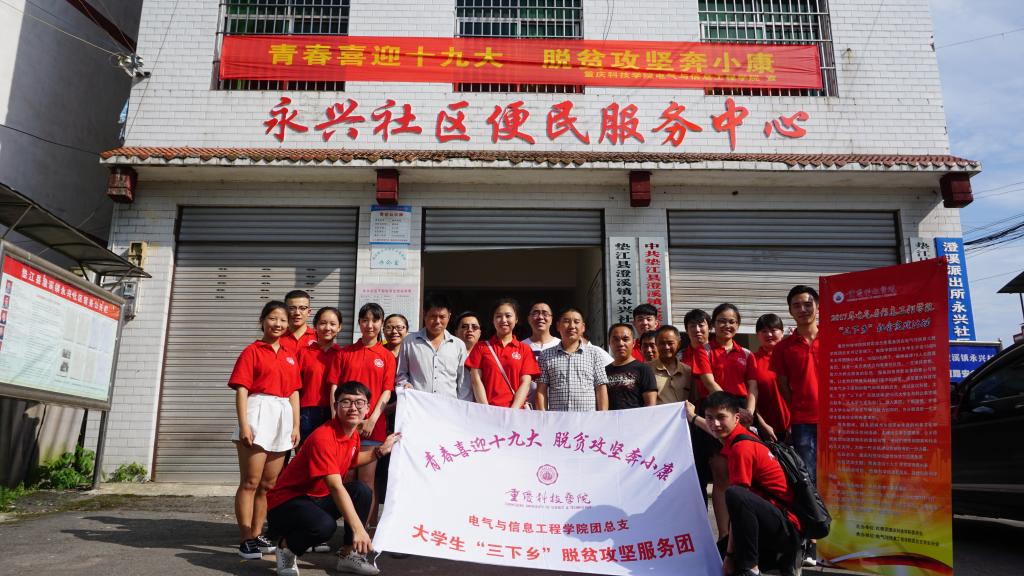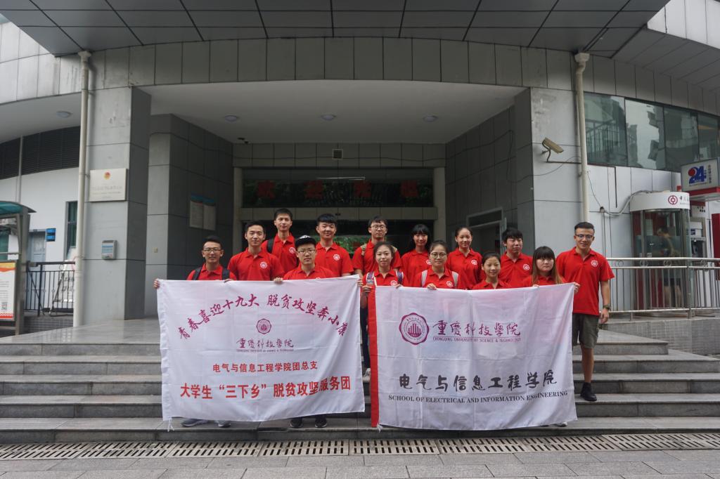 为正确引导当代大学生积极服务社会、传递青春能量,做有理想、有道德、有文化、有纪律的青年,将先进的文化、科技、卫生方面的内容知识带到乡镇,促进乡镇文化、科技、卫生的发展,重庆科技学院电气与信息工程学院脱贫攻坚志愿服务团在团总支书记杨春艳老师的带领下,集结团队共16人,于7月13日上午八点正式开启了“三下乡”实践活动。活动以“青春喜迎十九大 脱贫攻坚奔小康”为主题,将青春的扶贫服务之火传递到了垫江县澄溪镇。