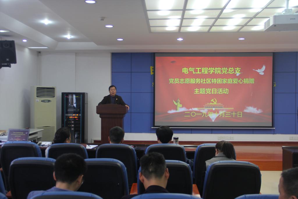为深入开展“不忘初心、牢记使命”主题教育,强化党员全心全意为人民服务的宗旨意识,激励党员发挥先锋模范作用,助力脱贫攻坚,10月30日上午,电气工程学院党总支召开志愿服务社区特困家庭爱心捐赠主题党日活动。全院100多名党员参加了本次活动,活动由党总支书记郑远平主持。