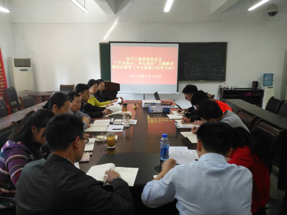 10月18日下午,电气工程学院党总支在逸夫楼I408党员之家召开“不忘初心、牢记使命”主题教育第四次集体研学暨中心组第17次学习会。学院总支委员、党政领导、院长助理、党支部书记及科级以上干部参加了会议,会议由电气工程学院党总支书记郑远平主持。