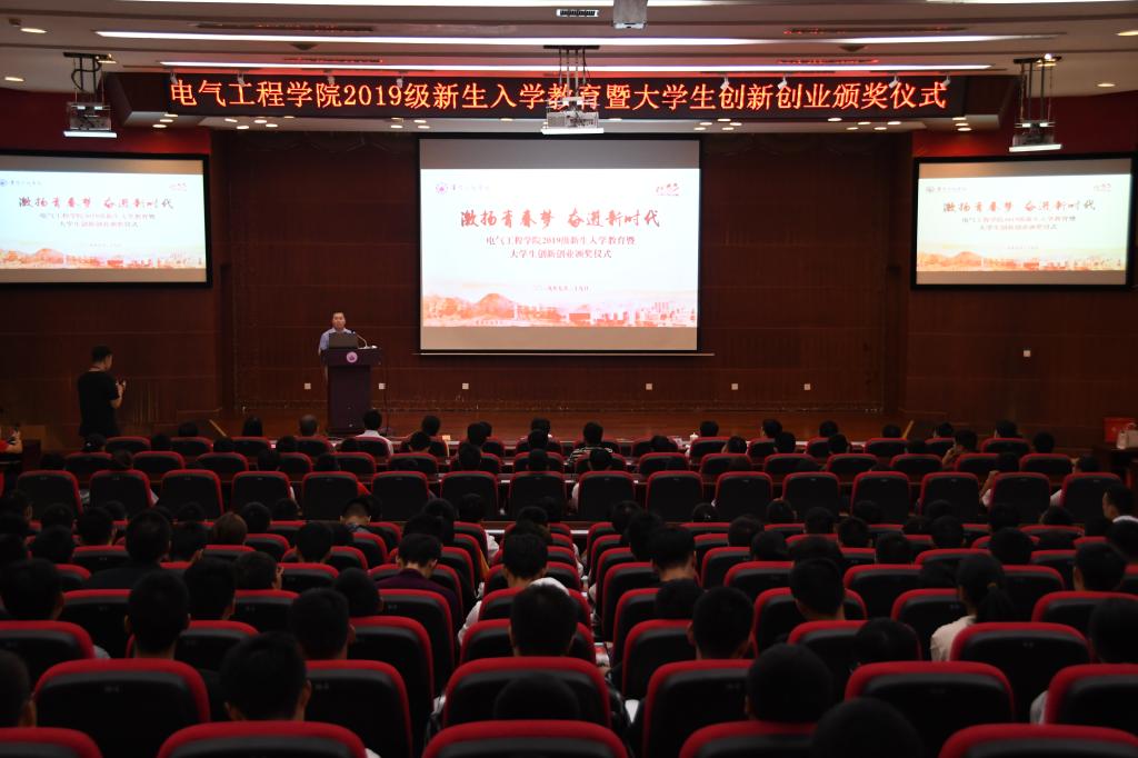 为帮助2019级新生尽快适应大学学习生活、明确目标、端正态度、科学规划,9月29日,电气工程学院在学术报告厅举行“激扬青春梦,奋进新时代”2019级新生入学教育暨大学生创新创业比赛颁奖仪式。校党委副书记、副校长施金良,学生工作部部长张琪,优秀校友代表格力电器(重庆)有限公司技术骨干罗讯、电气工程学院党政领导、各系(中心)主任、专业负责人、专兼职辅导员、2019级新生全体共计300余人参加了本次活动。