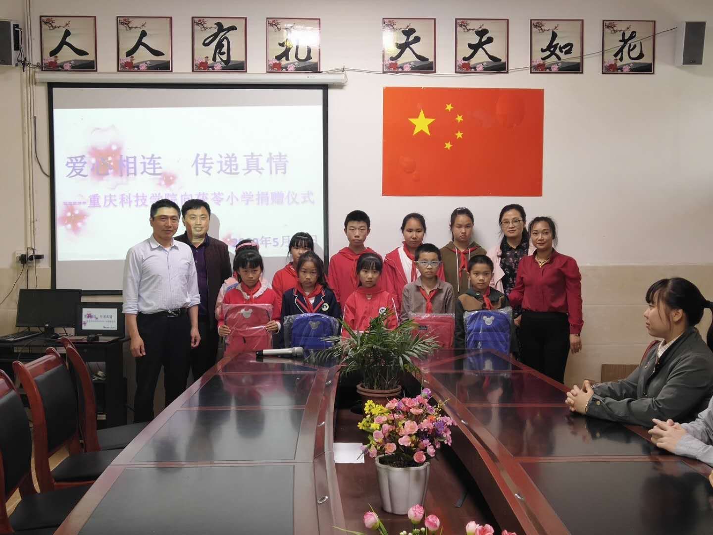 冯旭平代表重庆科技学院电气工程学院向茯苓小学的同学们发放了书包、文具盒、笔记本等学习用品,并寄语同学们要努力学习,刻苦钻研,长达以后做一个对家乡、对祖国、对人民有用的人。