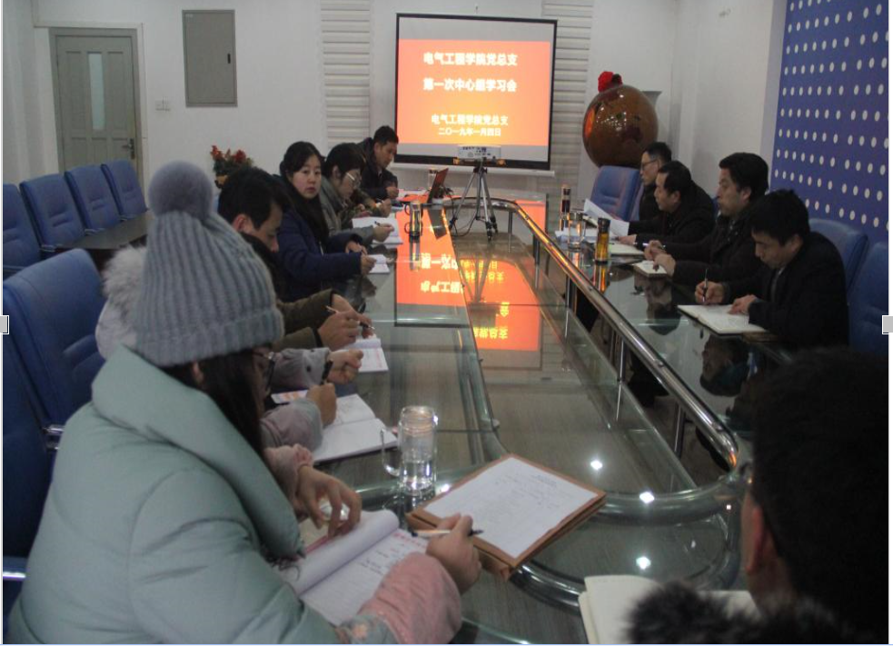 1月4日上午,电气工程学院党总支在逸夫楼I412-1召开新年第一次中心组学习会。学院党政领导班子、党总支委员、党支部书记参加了会议。会议由学院党总支书记郑远平主持。