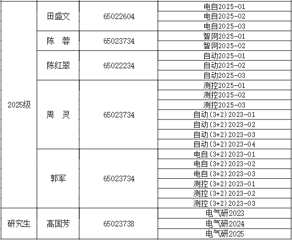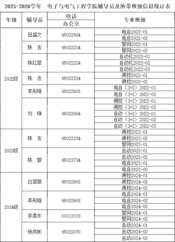 2025-2026学年 电子与电气工程学院辅导员及其所带班级信息统计表